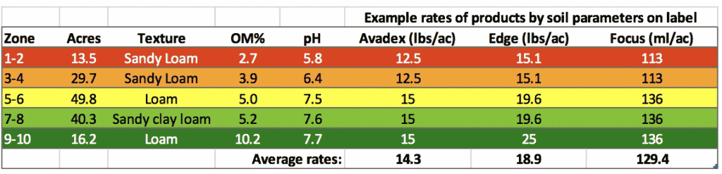 But where the real value of a SWAT MAP and VR capability might be is getting better control of weeds with whatever soil applied herbicide you use, avoiding crop injury, and maybe even saving money. Three examples are shown in table 1 below of some common products and their rates that should be applied based on the product label and soil in each part of the field.