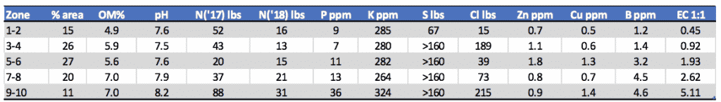 Using the above field in western MB as an example, you can see that the lower zones (especially zones 7-10) are affected by salinity. At an EC of 5.1 in zone 10 very little would grow. The long-term solution is tiling to leach salts away, but in the meantime fertilizer inputs can be managed using VR. This is arguably the simplest and easiest way to get an ROI from this technology, since salinity will be the dominant factor. Zones 9-10 have lots of nutrients in the soil, but the crop won’t use them due to salinity. We are able to cut back rates in those areas and re-allocate nutrients to where they are needed more. There is a strong case for VR phosphate in this field, where zones 1-4 would be very responsive, while zones 9-10 would be relatively unresponsive. Sulphur follows a similar trend, since it moves with water and is associated with salts in the soil - any areas of the field with salinity will not need more sulphur! This grower has also managed to get his zone 9-10 soil N levels in check from fall of 2017 to fall of 2018, greatly reducing the potential of nitrogen loss through denitrification, since zones 9 and 10 are also the areas most prone to saturated soil. This is a fantastic example of the environmental benefit of this technology.