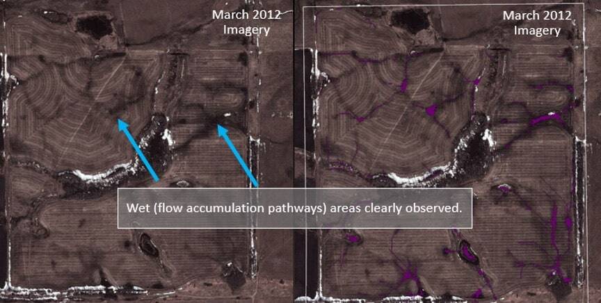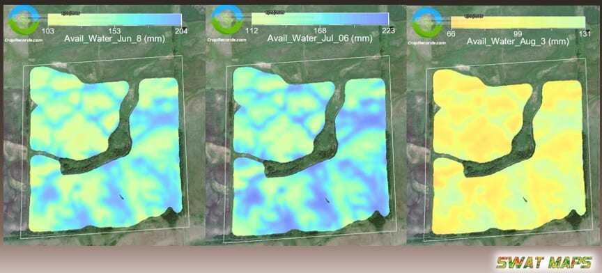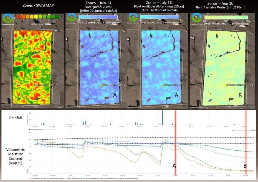 Leveraging the SWAT MAPS variable rate technology, Croptimistic Technology Inc. has developed SWAT WATER, a zone-based soil moisture balance aimed at providing volumetric moisture content (VMC) and crop available water daily. SWAT WATER maps enhance SWAT MAPS by incorporating field hydrology such as overland flow characteristics, by identifying which areas will pond and for how long, as well as soil physical characteristics and soil moisture probe data.