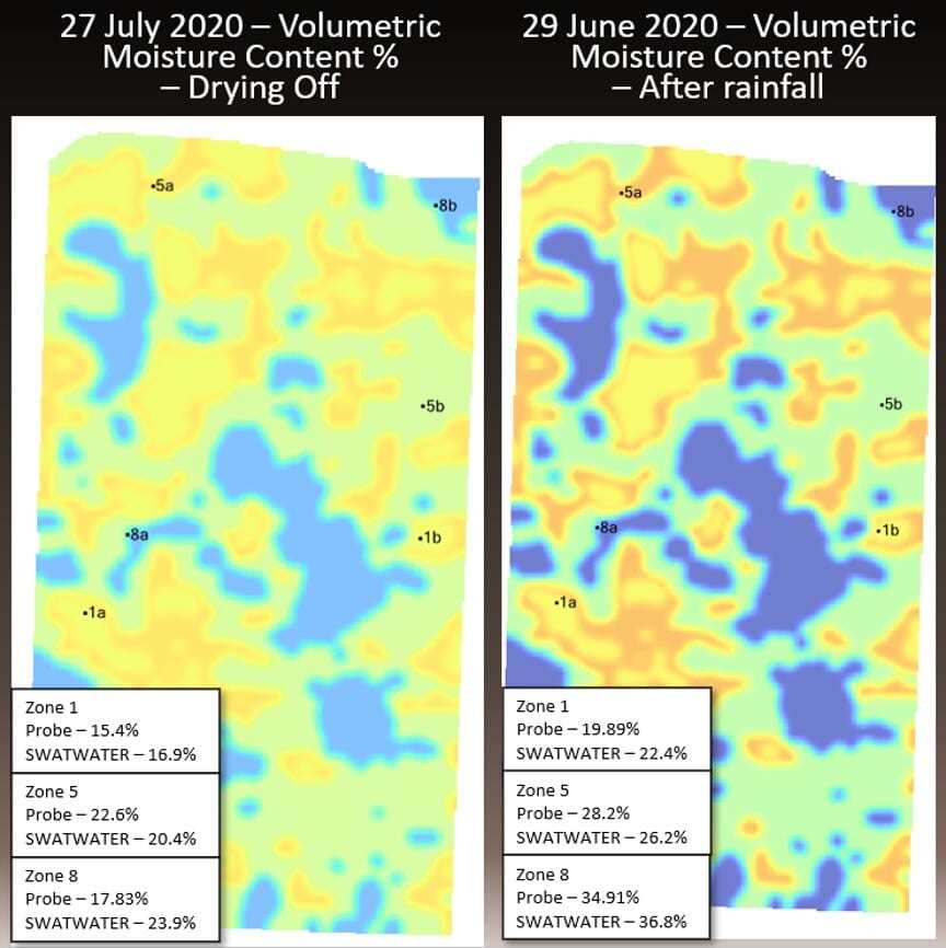 For growers, one of the questions which is repeatedly asked is “where should I place my soil moisture probe?" The SWAT MAPS process provides a platform off which probe installations can be guided to ensure the data obtained from soil moisture probes is relevant to the soil and moisture variability of the field. By guiding this process, the SWAT WATER maps are effectively “ground truthed” and soil moisture probes are more effectively used to understand not just a single location, but the relevance of that location to the rest of the field and all zones within a field.