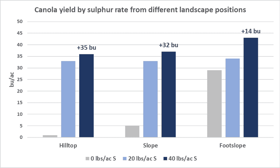 In the above example, the hilltop had an incredible response to added sulphur - an additional 35 bu/ac. In fact, without added sulphur the canola yielded almost nothing, so it’s safe to say sulphur was the limiting factor! The higher yielding footslope also had a strong response, but not as high as the hilltop or midslope position. In this field, the ROI from 40 lbs of sulphate-S was better on the hilltop than the footslope, even though the footslope yielded more.