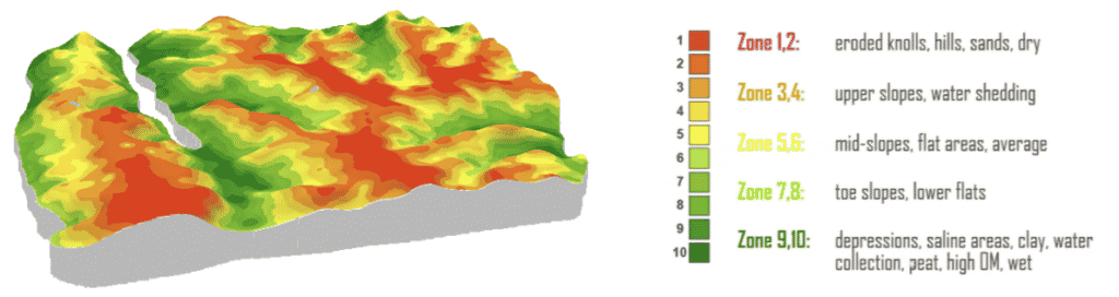 A zone 5 in the yellow would likely have sufficient water holding capability and better soil attributes. Average populations in these areas could be the recommendation. These zone 5s could have an average yield potential and medium response to fertilizer.