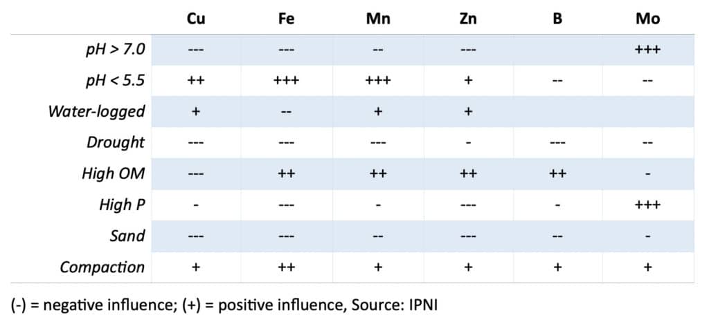 Soil extractions for testing plant-available micronutrients are a good start to determining deficiency levels and for pinpointing areas of fields that may need a micronutrient top-up. However, a soil extraction sometimes does not extract all the nutrient because the nutrient is bound in unavailable chemical fractions in the soil or has transformed into a different chemical species. Due to this, the ppm of micronutrients can be thought of more like guidelines and a reactive approach is often taken to mitigating deficiencies with in-season foliar micronutrient applications.