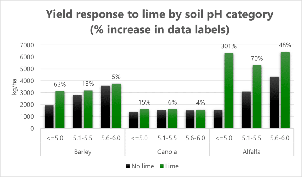 Figure 2. Yield response of barley, alfalfa, and canola to lime. Note barley yields are the mean of two cultivars. Penney et al., 1977.