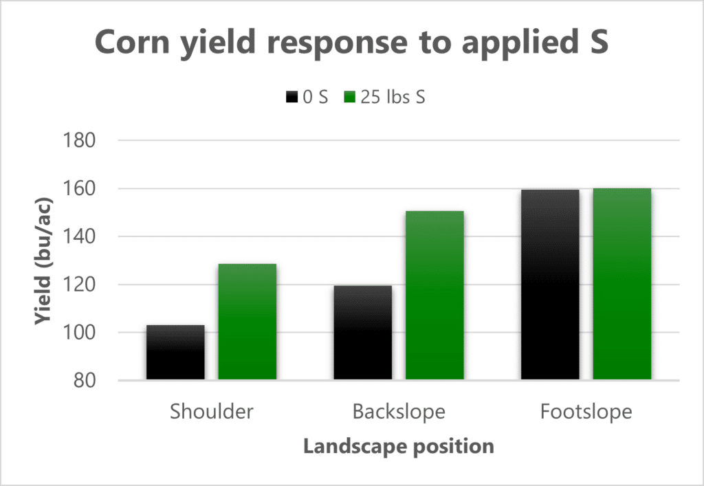 Figure 4. Corn response to sulfur by landscape position. Woodard and Bly, 2000.