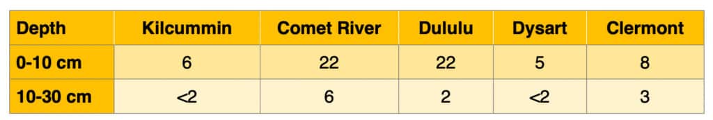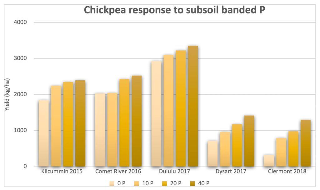 Figure 3a. Chickpea response to deep P bands in central Queensland. Yield increases with 40 kg/ha P (82 lbs P2O5/ac) over 0 P check shown in data labels. Sands et al., 2022