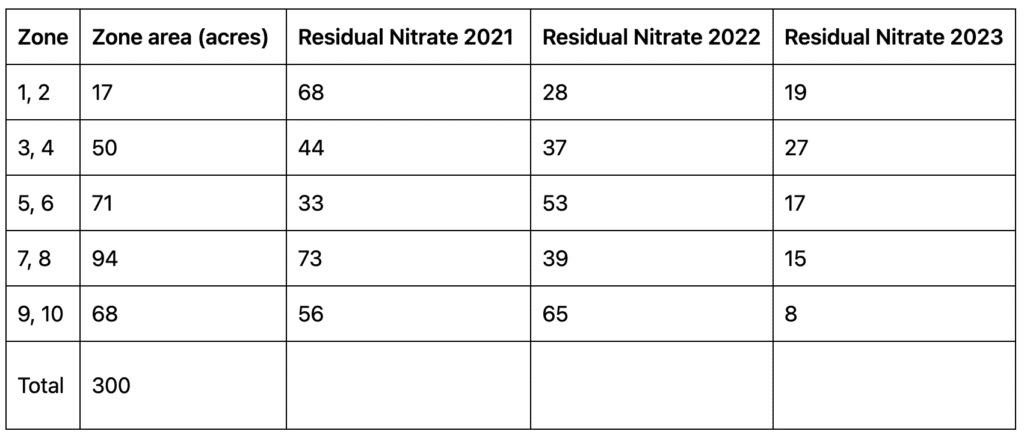 Table 1. SWAT MAPS zone-based soil nitrate test results (lbs/ac) from 0 to 8" in the Dark Brown Soil Zone of southern Alberta from fall of 2021, 2022, and 2023.