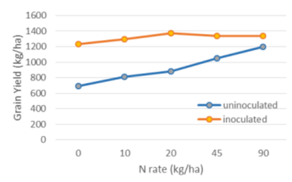 Pulses will fix the majority of plant nitrogen requirements if inoculated properly. Pulses grown on fields with high residual nitrogen have the risk of excessive growth leading to lodging, disease and poor nodulation. Research by Guy Lafond at Agriculture and Agri-Food Canada shows that pea fields with up to 54 lbs/ac residual nitrate did not have any impact on yield. Even though fields with high residual nitrate did not have a negative impact on yield it may be economically beneficial to select fields with lower nitrate levels allowing for other crops to take advantage of fields with higher residual levels. Having soil sampling completed by your SWAT CERTIFIED consultant will help provide the knowledge to make a more informed decision how to better match soil nitrate levels to crop choice. With poor nodulation the pulse crop uses higher amounts of nitrogen from the soil and may not produce nodules. This may lead to the plant running out of nitrogen later in the season because they may not be able to fix enough nitrogen. Results from a study done by Bremer et al. (1989) showed that even when high rates of nitrogen were applied on lentils, up to 80 lbs/ac, the inoculated treatments were the highest yielding.